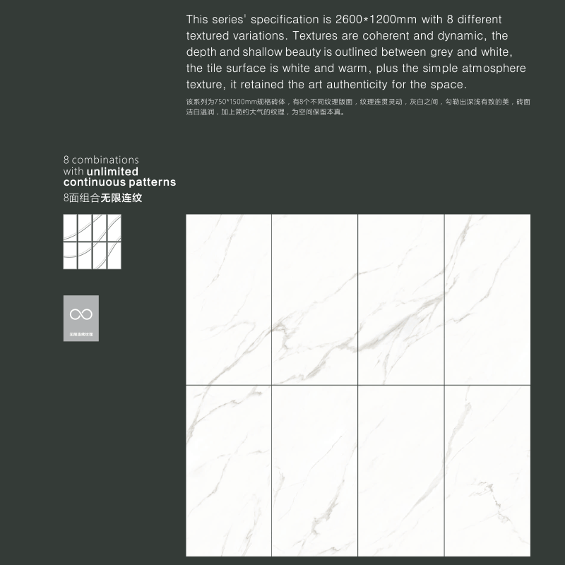 该系列为750*1500mm规格砖体,有8个不同纹理版面,无限连纹组合拼接,纹理连贯灵动,灰白之间,勾勒出深浅有致的美,砖面洁白温润,加上简约大气的纹理,为空间保留本真。