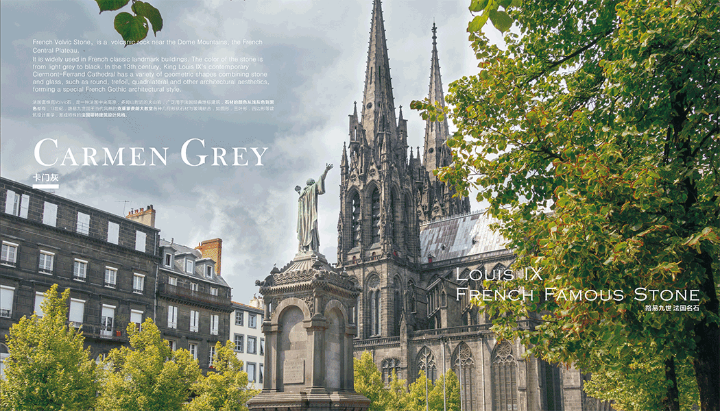 ,广泛用于法国经典地标建筑,石材的颜色从浅灰色到黑色都有,13世纪,路易九世国王当代风格的克莱蒙费朗大教堂各种几何形状石材与玻璃结合,如圆形,三叶形,四边形等建筑设计美学,形成特殊的法国哥特建筑设计风格。