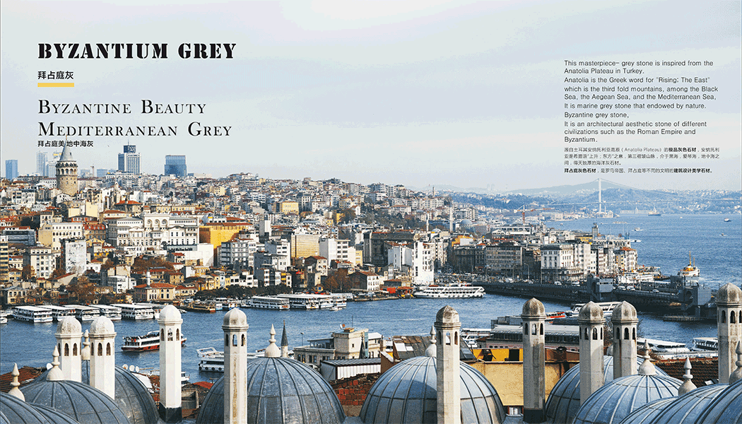 源自土耳其安纳托利亚高原(Anatolia Plateau)的极品灰色石材,安纳托利亚是希腊语“上升;东方”之意,第三褶皱山脉,介于黑海,爱琴海,地中海之间,